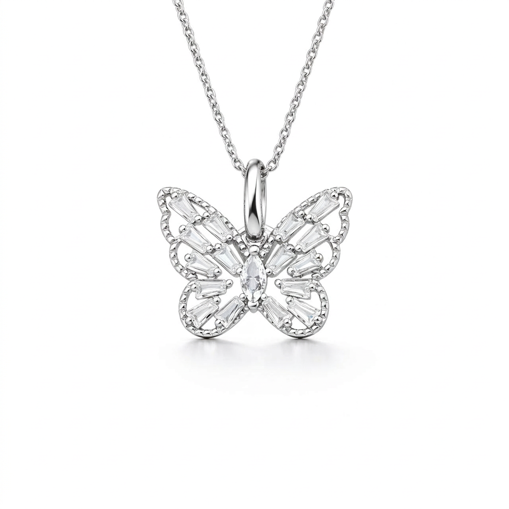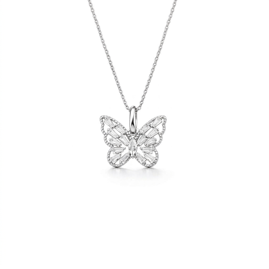 Delikatny i niezwykle kobiecy naszyjnik wykonany z wysokiej jakości srebra próby 925 to doskonały wybór dla miłośniczek subtelnej biżuterii. Uroczy motyw motyla symbolizuje lekkość, przemianę i piękno, a precyzyjnie osadzone białe cyrkonie dodają całości eleganckiego blasku. Dzięki rodowaniu naszyjnik zachowuje swój połysk na dłużej i jest bardziej odporny na zarysowania oraz matowienie.